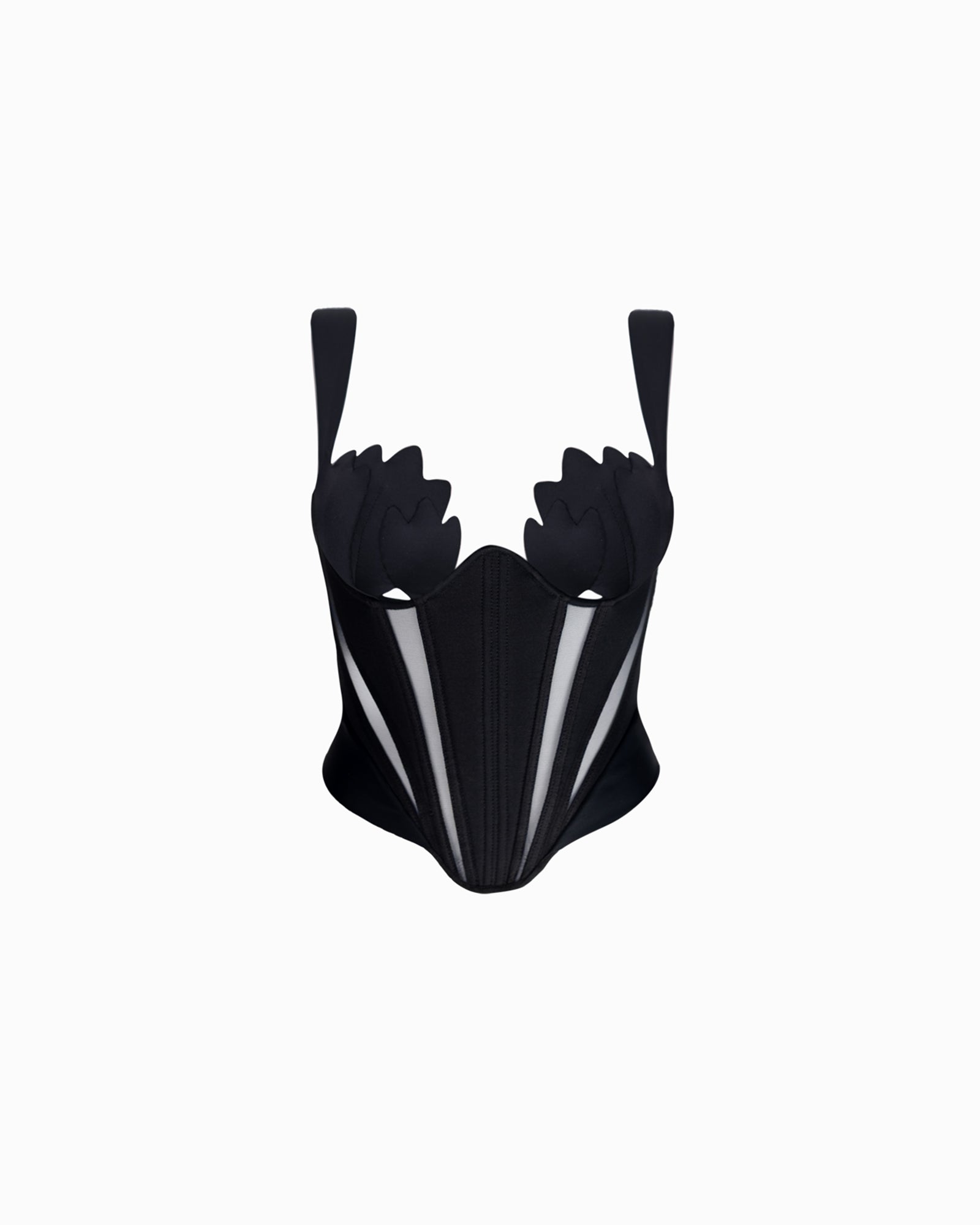 Gorset Flower Dawn to połączenie zmysłowego designu z perfekcyjnym dopasowaniem. Czarne miseczki w kształcie kwiatowych płatków subtelnie modelują biust, dodając mu objętości i eleganckiego podtrzymania. Wbudowane fiszbiny pod każdą miseczką gwarantują stabilność i rzeźbiący efekt.