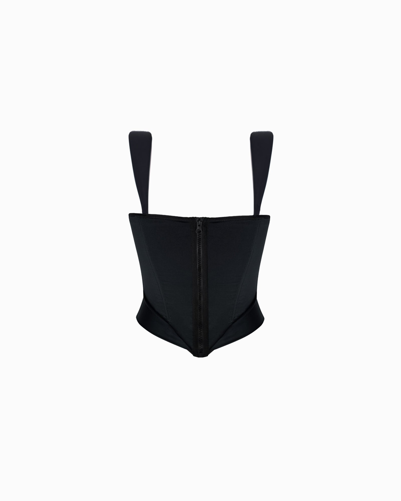 Dolna część gorsetu wykonana jest z transparentnej siateczki, która optycznie wysmukla talię i podkreśla sylwetkę. Idealnie sprawdzi się jako czarny gorset wieczorowy lub top do spódnicy z wysokim stanem.